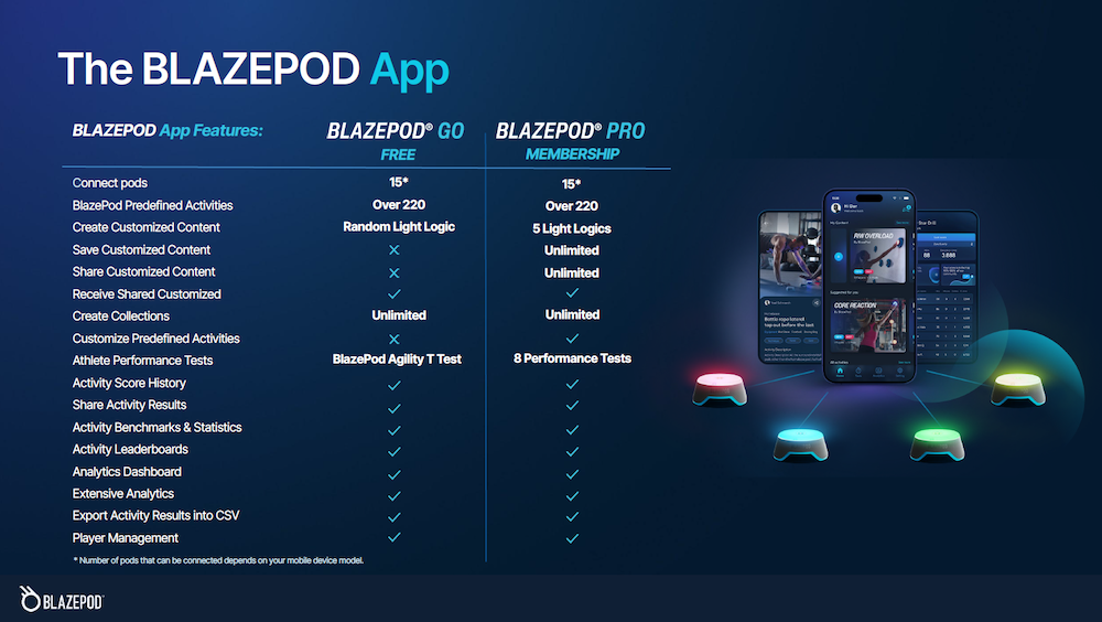 BLAZEPOD stimulerer kroppens respons gennem reaktions- og koordinationsøvelser. Denne pakke indeholder 4 Pods, der nemt kan bruges med den kompatible træningsapp. BLAZEPOD kan bruges alene i holdtræning, eller hvorfor ikke prøve at gøre det til en konkurrence? Vælg dit træningsprogram i appen, og hold styr på alle dine træningsdata. Træningsdataene gemmes, så du kan optimere din præstation og dine mål samt spore dine fremskridt i din træning. Det er også muligt at forbinde flere enheder, hvilket gør det nemt at opbygge endnu flere træningsprogrammer. Alt styres fra din egen smartphone ved hjælp af "Bluetooth lavenergiteknologi". Download BLAZEPOD-appen fra Google Play eller App Store. Vælg en af flere foruddefinerede aktiviteter, hvor du kan måle og gemme alle dine træningsdata. BLAZEPOD-appen godkender automatisk dine pods. Vælg en foruddefineret aktivitet i appen, og du er klar til at starte. Blazepod GO er inkluderet som standard, mens BlazePod PRO koster ekstra. Dette inkluderer: BlazePod Standard 4 stk. - 4 Pods - 1 BLAZEPOD “smart” oplader - 1 Opbevaringspose
